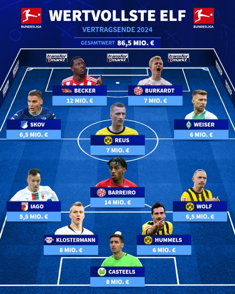德甲将成为自由球员最贵阵:罗伊斯、胡梅尔斯、沃尔夫在列