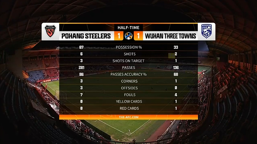 三镇半场数据:控球率33%,2次射门1次射正,1粒进球1张红牌