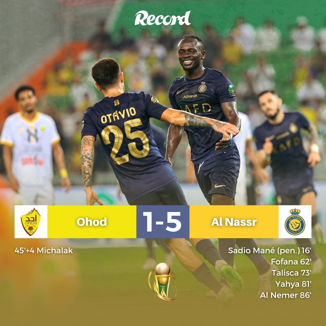 沙王冠第1轮,马内点射、塔利斯卡头槌、C罗轮休,利雅得胜利5-1尤胡德晋级下一轮。